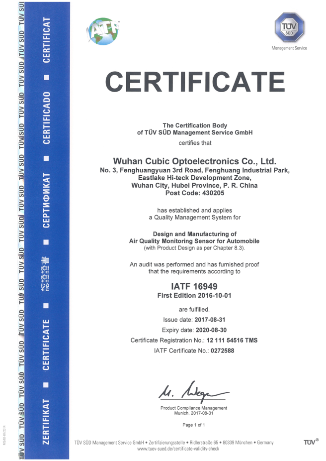 2017年8月31日,四方光電股份有限公司IATF16949:2016質(zhì)量管理體系通過國家認(rèn)證機(jī)構(gòu)TüV SüD管理服務(wù)有限公司認(rèn)證部(The Certification Body of TüV SüD Management Service GmbH)的審核并獲得資格認(rèn)證證書,標(biāo)志著四方光電順利取得進(jìn)入汽車供應(yīng)鏈的通行證。